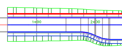 - 左右の歩道は、動的な計画線として抽出され、基線として追加されています。これらの基線に、法面展開アセンブリがアタッチされています。