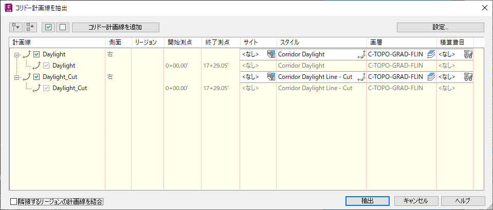 - [抽出] をクリックすると、計画線が抽出されます。