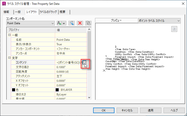 をクリックして、プロパティをテキスト ウィンドウに挿入します。次の例では、ラベル スタイルでポイント番号の後にタイプ プロパティが追加されています。