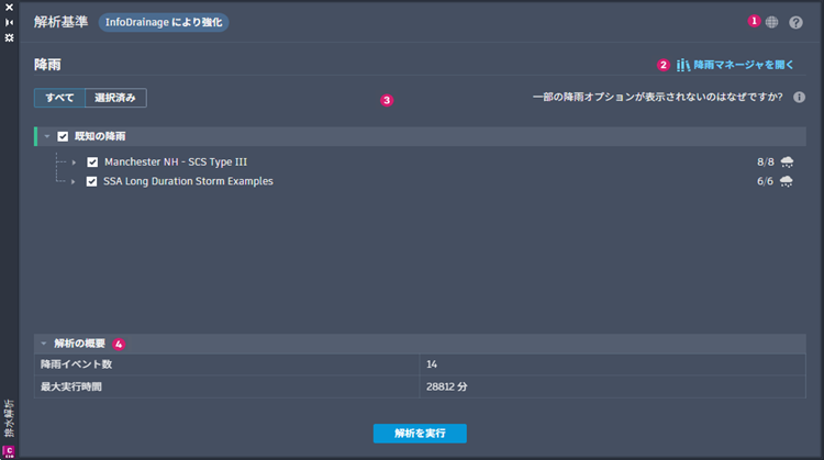 最初の解析基準ユーザ インタフェースでは、降雨データを指定して現在の排水システムをテストできます。プロジェクトに対して降雨セットが設定されていない場合は、インタフェースからのみ降雨マネージャを開くことができます。解析プロセスを開始するには、降雨データが必要です。