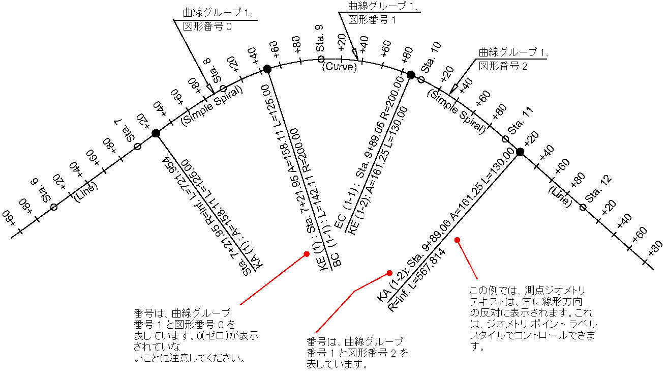 線形を作成すると、[線形ラベル]ダイアログ ボックスで指定されているラベルを使用して、その線形に自動的にラベルが付けられます。このラベルは、主測点および副測点のような、特定のポイントの線形に適用されます。