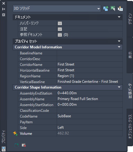 既定では、Autodesk Civil 3D にはコリドーや 3D ソリッドとボディに適用するプロパティ セット定義が 3 つ含まれています。