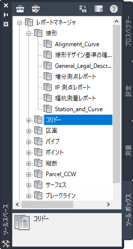 [ツールスペース]の[ツールボックス]タブは、レポートや拡張機能を実行するための重要なインタフェースです。[測量]タブと同様、[ツールボックス]タブは必要に応じて表示または非表示にできます。
