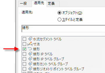 ほとんどのラベル タイプでは、スタイル管理の[適用先]タブで、関連するオブジェクトのラベル タイプではなく、ラベル付けするオブジェクト タイプを選択します(例外については次の項を参照してください)。たとえば、プロパティ データを使用して線形にラベルを付けるには、プロパティ セット設定時に[線形]を選択します。