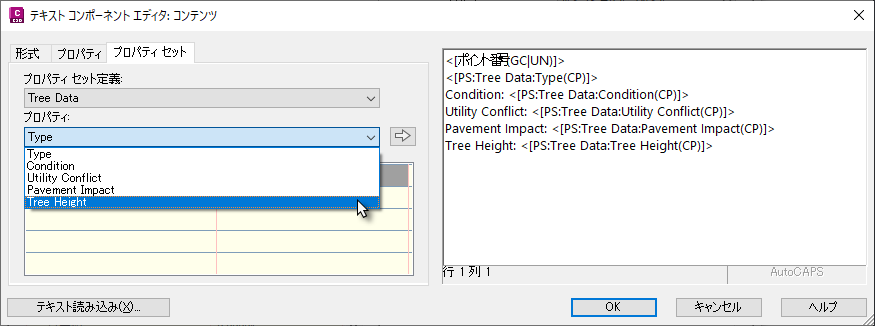 このプロパティ セットを点に適用し、テキスト コンポーネント エディタを使用して、関連するプロパティ セット データを投影ラベル スタイルに追加します。