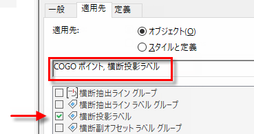 たとえば、プロパティ セット データを使用して横断ビューで Autodesk Civil 3D の点投影にラベルを付けるには、プロパティ セット定義の設定時に、スタイル管理の[適用先]タブで[横断投影ラベル]と[COGO ポイント]を選択します。