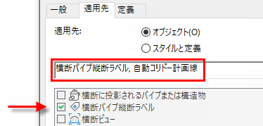 プロパティ セット データを投影ラベル スタイルに含める場合は、横断ビューで投影位置が表示されているオブジェクト タイプに加えて、[横断投影ラベル]オブジェクト タイプを選択する必要があります。