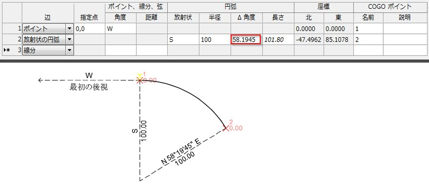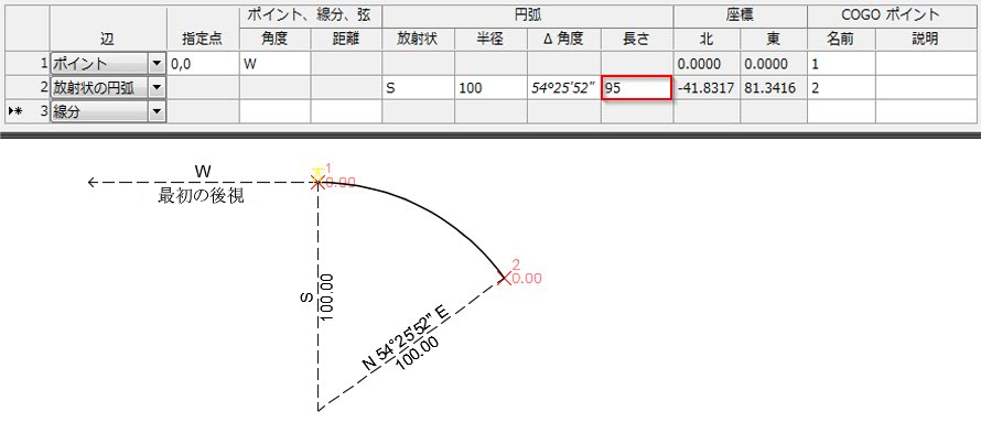 半径と円弧のデータを入力する場合は、半径の方向を指定してから、デルタ角度または長さを指定する必要があります。デルタ角度と長さの入力値は通常のフォントで表示され、計算後の値は斜体で表示されます。