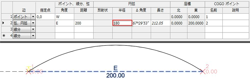 弦と円弧のデータを入力する際に、角度と距離を指定する必要があります。必要に応じて、半径、デルタ角度、または長さを指定することができます。半径、デルタ角度、長さの入力値は通常のフォントで表示され、計算後の値は斜体で表示されます。次の図は、半径の値として 180 を入力した場合の例を示しています。この場合、デルタ角度の値として 67° 29' 53"、長さの値として 212.05 がそれぞれ自動的に計算されます。
