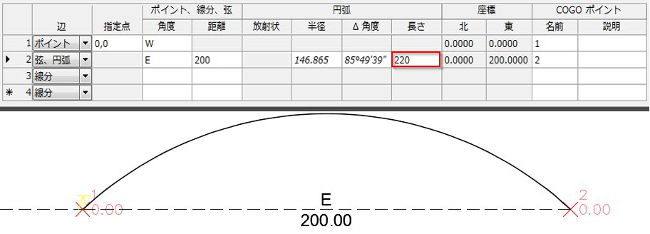 斜体で表示されている値を、手動で別の値に変更することができます。その場合、他の 2 つの値が再計算され、斜体で表示されます。次の図は、長さの値を 220 に変更した場合の例を示しています。この場合、半径の値として 146.87、デルタ角度の値として 85° 49' 39" がそれぞれ自動的に再計算されます。