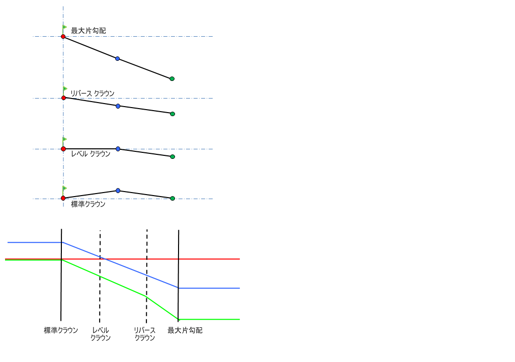 横断勾配摺り付け図の説明については、「概要 - 横断勾配摺り付け回転軸の基点設定方法」を参照してください。