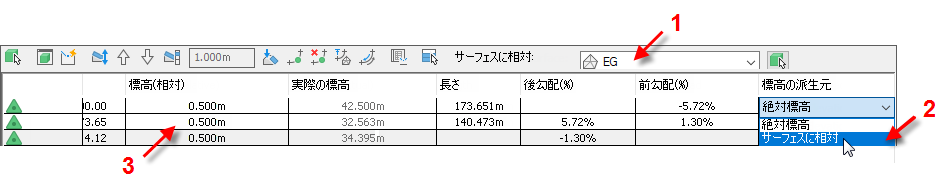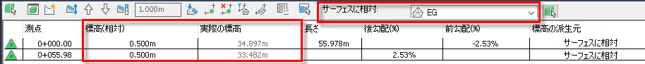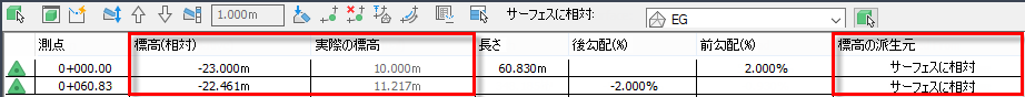この計画線をサーフェス EG に対する相対的な計画線に変更すると、実際の標高は変更されませんが、[標高(相対)]列には、計画線とサーフェスとの標高の差異が表示されます。