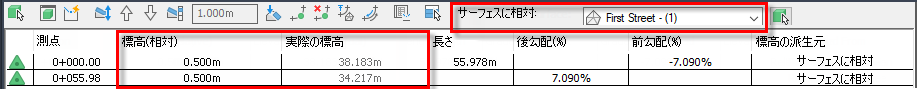サーフェス名を「First Street」に変更すると、[標高(相対)]列の値が「First Street」サーフェスの標高に適用され、[実際の標高]列の新しい標高になります。