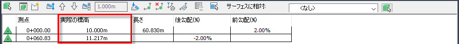 計画線の開始測点と終了測点の間に標高ポイントを挿入して中間標高ポイントを作成します。