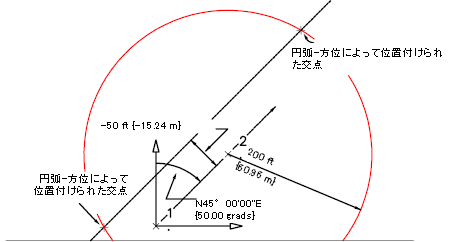交点は、ポイント 2 を中心とする半径 200 の円弧と、ポイント 1 から作成された方位 50.0000、左オフセット距離 50 の線分の間に配置されます。