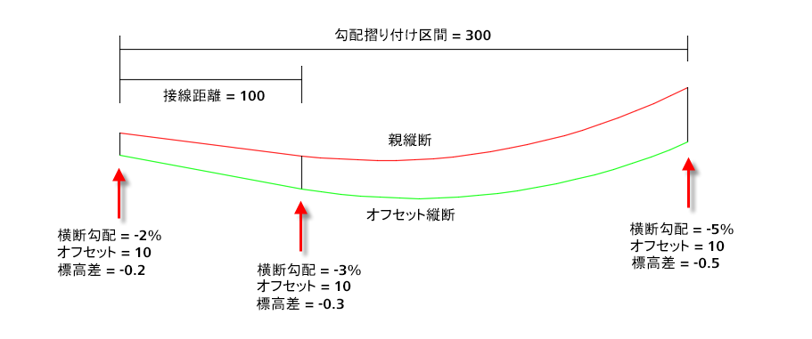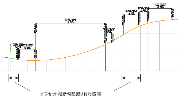 ある横断勾配と別の横断勾配の間に指定された摺り付け区間が存在する場合、次の例に示すようなオフセット縦断ジオメトリが作成されます。