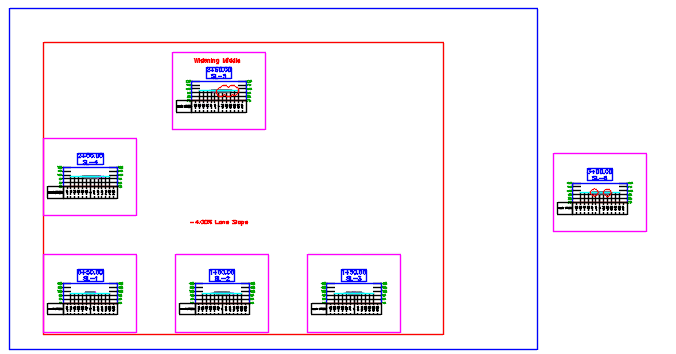次の図では、横断ビューの周囲に配置されている製図バッファが赤紫色で表示されています。シートに追加された製図要素は赤で表示されています。