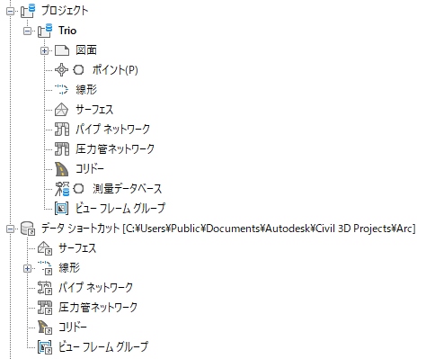 図は Trio という Vault プロジェクトと Arc というデータ ショートカット プロジェクトのコレクションを示しています。どちらのプロジェクト タイプも既定のプロジェクト テンプレートから作成されています。したがって、サーフェスや線形などのオブジェクトについては同じコレクションを持っており、各オブジェクトは複数の図面で参照することができます。