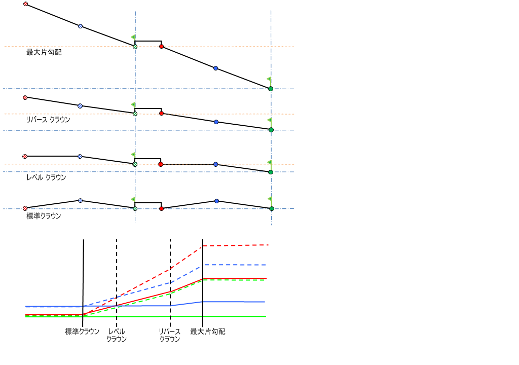横断勾配摺り付け図の説明については、「概要 - 横断勾配摺り付け回転軸の基点設定方法」を参照してください。
