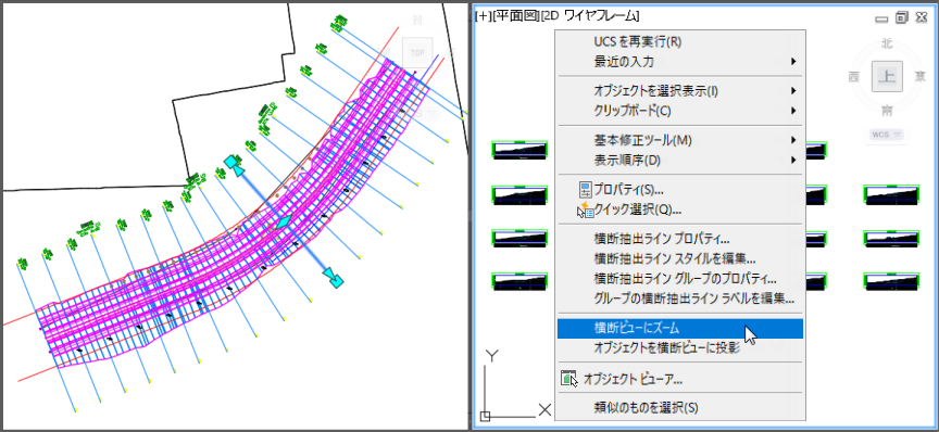 図面で複数のビューポートを設定している場合は、一方のビューポートで横断抽出ラインまたは横断ビューを選択し、もう一方のビューポートをクリックしてアクティブにした後、適切な[ズーム]コマンドを実行することができます。
