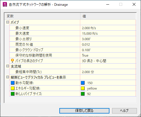 - パイプの既定の粗度係数(マニングの公式における n 値)を指定します。