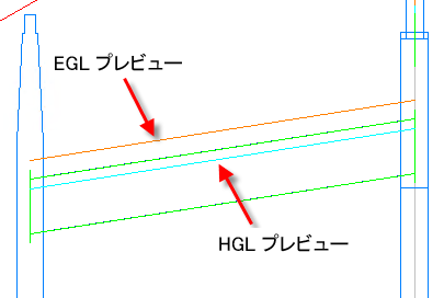 次の図は、プレビューに表示されているエネルギー勾配線(EGL)と動水勾配線(HGL)の詳細を示します。