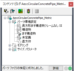 パラメトリック作成環境を開いた場合、パーツ ブラウザの最上位フォルダは[パーツ環境設定]フォルダです。パーツ環境設定は、ドメイン(パイプまたは構造物)、タイプ、およびサブタイプに基づいてパーツの特性と動作を定義するもので、パーツを保存するために必要になります。パーツを適切に検証および保存するには、パーツを作成する前にパーツ環境設定を定義する必要があります。