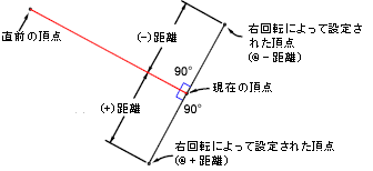 測量図形に正方形の辺を作成して、左折および右折を定義します。これは、建物の計画線を製図する場合に役立ちます。このコマンドを適切に使用するには、現在の測量図形に頂点が最低 2 つ必要です。