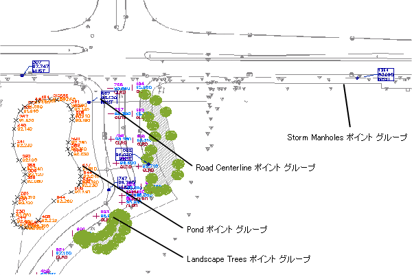 ポイント グループを使用して、ポイントをグループ化したり図面での表示方法を指定することができます。ポイント グループは、ポイント データを直接参照し、ポイントを描画する役割を担います。ポイント グループにはグループ内のすべてのポイントに影響する優先設定があり、個々のポイントに割り当てられたスタイルよりもそのグループに対して選択されたポイント スタイルやポイントラベル スタイルの両方が使用されます。