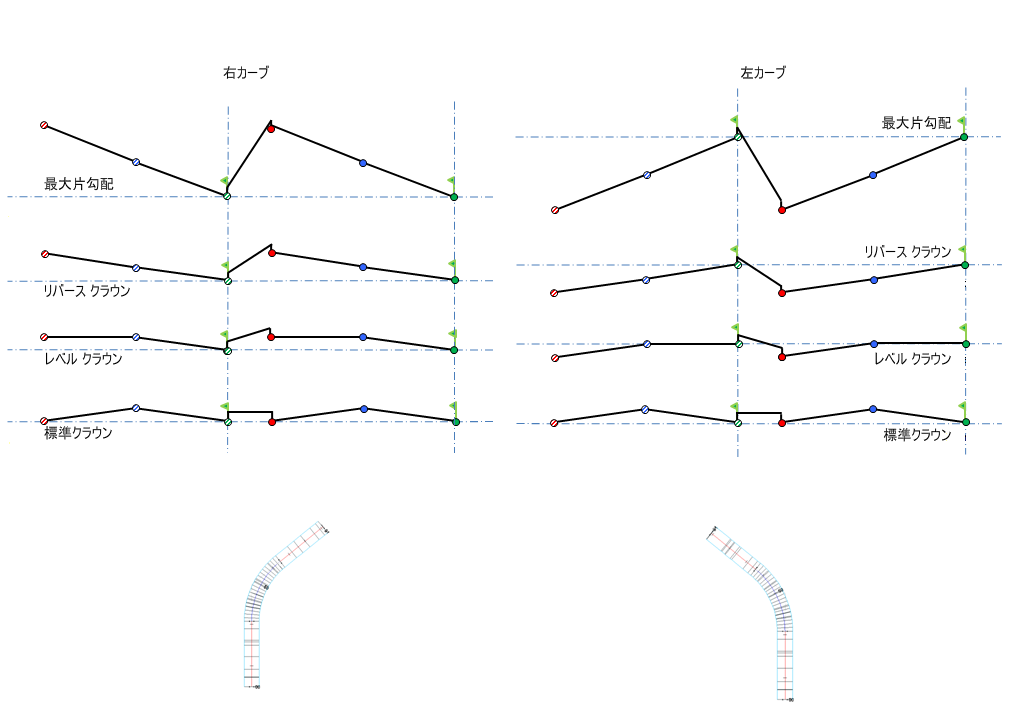 横断勾配摺り付け図の説明については、「概要 - 横断勾配摺り付け回転軸の基点設定方法」を参照してください。