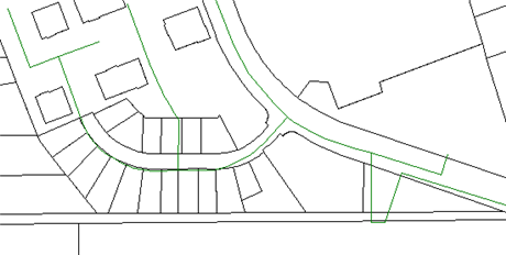 区画(黒い境界のポリゴン)と下水管(緑色の線)のみが図面領域に表示されます。