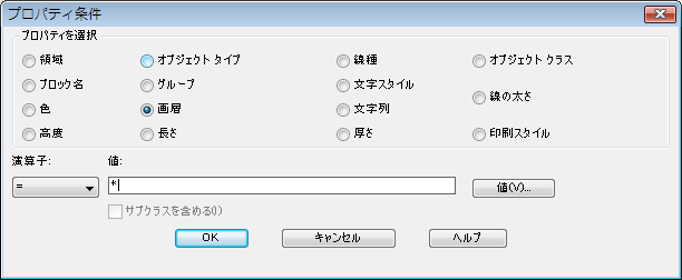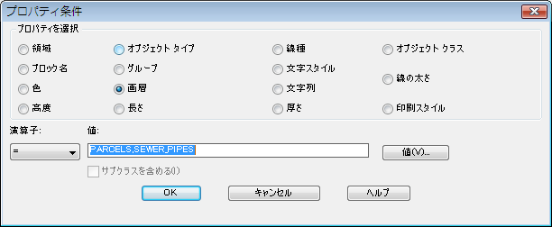 プロパティ条件として[画層]を選択します。 指定した画層上のオブジェクトのみがマップに追加されます。