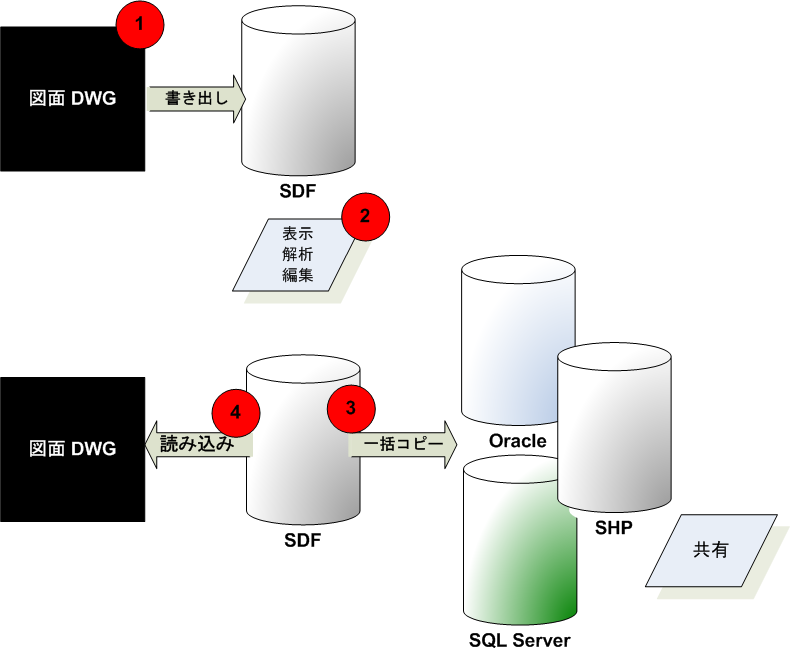 | マップまたは個々の図面画層を Autodesk SDF 形式、SHP、または Oracle に書き出します。次に、[一括コピー]を使用して別の形式に移動します。 | 元の DWG データは変更されません。 |