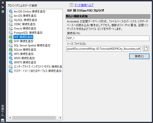 - [ソース ファイル](右側)で参照ボタンをクリックして、サンプルの City_Boundary.sdf ファイルにナビゲートします。[接続]をクリックします。