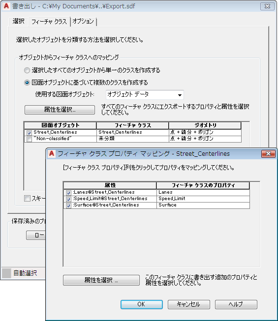 図面オブジェクトを書き出す際、オブジェクト データを使用して、SDF ファイルにフィーチャ クラスを作成することができます。作成されたフィーチャ クラスには、オブジェクト データ属性に対応するプロパティがあります。