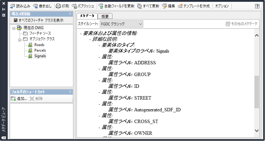 メタデータは、図面自体に格納されます。メタデータは、図面を編集するたび、または分類済みオブジェクトを含むアタッチされた図面に再接続するたびに更新されます。
