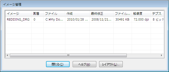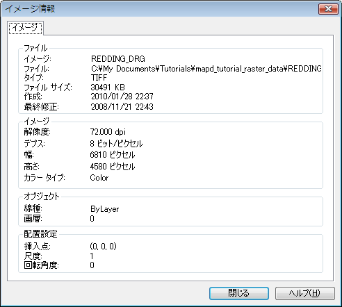 挿入したイメージのファイル名、サイズ、解像度、深さ、タイプを表示することができます。また、イメージを作成および変更した日付や、イメージが存在する画層も表示できます。