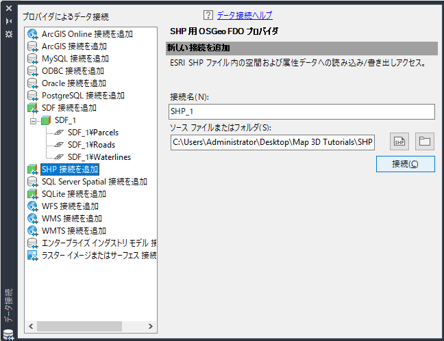 - [データ接続]ダイアログ ボックスの左側で、[SHP 接続を追加]をクリックします。