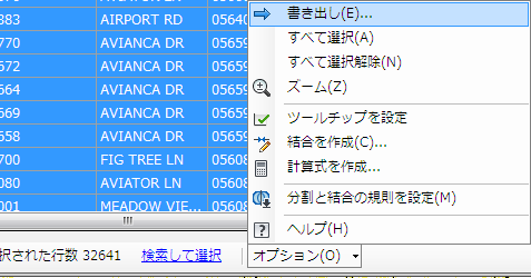 [データ テーブル]の建設区域の区画を表示します。カンマ区切りのファイルにデータを書き出します。データは、随意に使用できます。たとえば、レポートで使用したり、建設区域の区画所有者のメーリング リストの作成に使用できます。