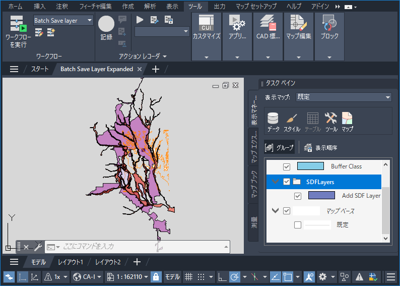 ワークフローを実行すると、AutoCAD Map 3D ツールセットは指定のフォルダにある SDF ファイルを一覧表示します。次に、作成された画層を保持するグループを[表示マネージャ]に作成します。指定のフォルダ内の SDF ファイルに接続し、指定のフォルダ内の各図面について、画層を[表示マネージャ]に接続および追加して、それらの画層を新しいグループに移動します。