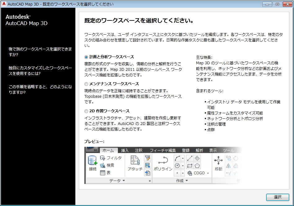 初めて AutoCAD Map 3D ツールセット を起動するときに、既定のワークスペースを選択します。