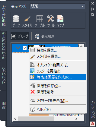 - [表示マネージャ]で、サーフェス画層を右クリックし、[等高線画層を作成]をクリックします。