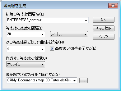 - [等高線を生成]ダイアログ ボックスでの[等高線の高度の間隔]リストで、[20]を選択します。