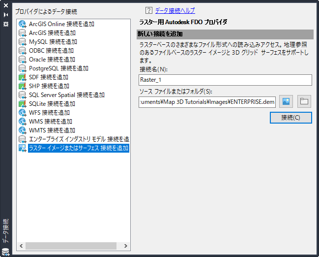 - [データ接続]ウィンドウの[プロバイダによるデータ接続]で、[ラスター イメージまたはサーフェス接続を追加]をクリックし、[ソース ファイルまたはフォルダ]の横の