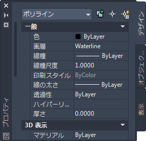 道路は AutoCAD 図面のオブジェクトです。現在の選択はポリラインとして定義されています。図面オブジェクトの場合、[プロパティ]パレット一部のプロパティの形式を設定できます。