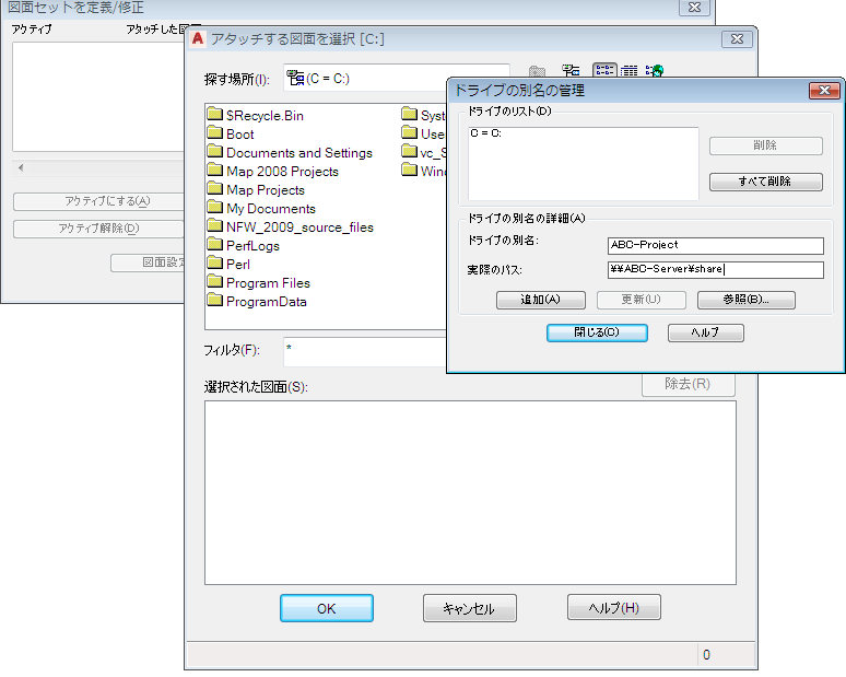図面の場所がドライブの別名にマップされました。これで、他に別名を定義することなく、そのフォルダ内の図面を開くことができます。