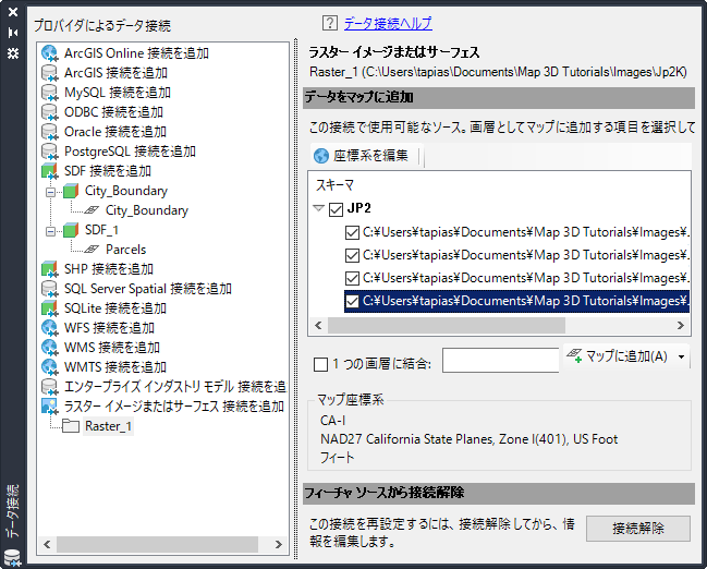 - [プロバイダによるデータ接続]で[ラスター イメージまたはサーフェス接続を追加]をクリックします。