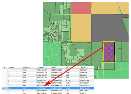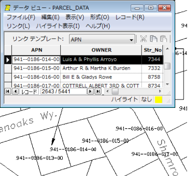 図面オブジェクトに属性データをリンクし、テーブル内でリンクされたデータを選択してマップ内のオブジェクトをハイライト表示することができます。