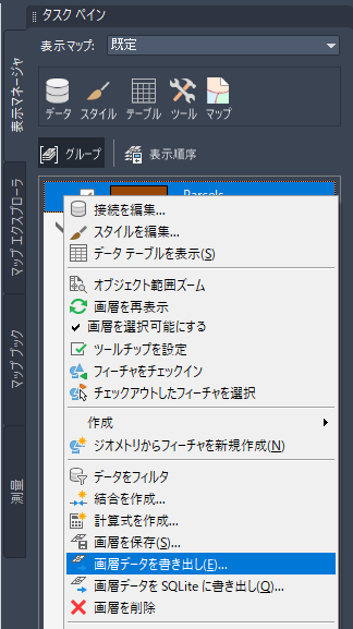 - [表示マネージャ]で[Parcels]画層を右クリックし、[画層データを書き出す]をクリックします。
