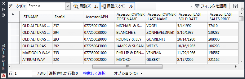 - [表示マネージャ]で、新しい SDF ファイルの Parcels 画層を選択し、[テーブル]をクリックします。
